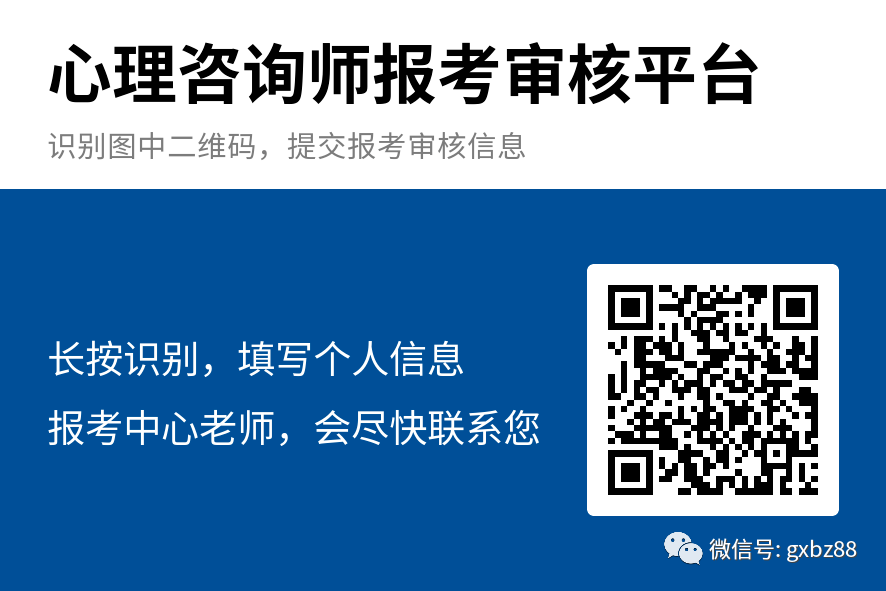 微信搜索公众号“gxbz88”,了解更新心理咨询师报考新政。http://tpf369.com/xlzxs.html